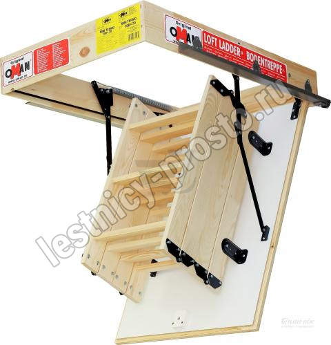 Лестница складная четырехсекционная, изготовлена из массива сосны. Термоизоляционная крышка типа "сэндвич" утеплена пенопластом толщиной 20 мм, облицована с двух сторон ДСП белого цвета