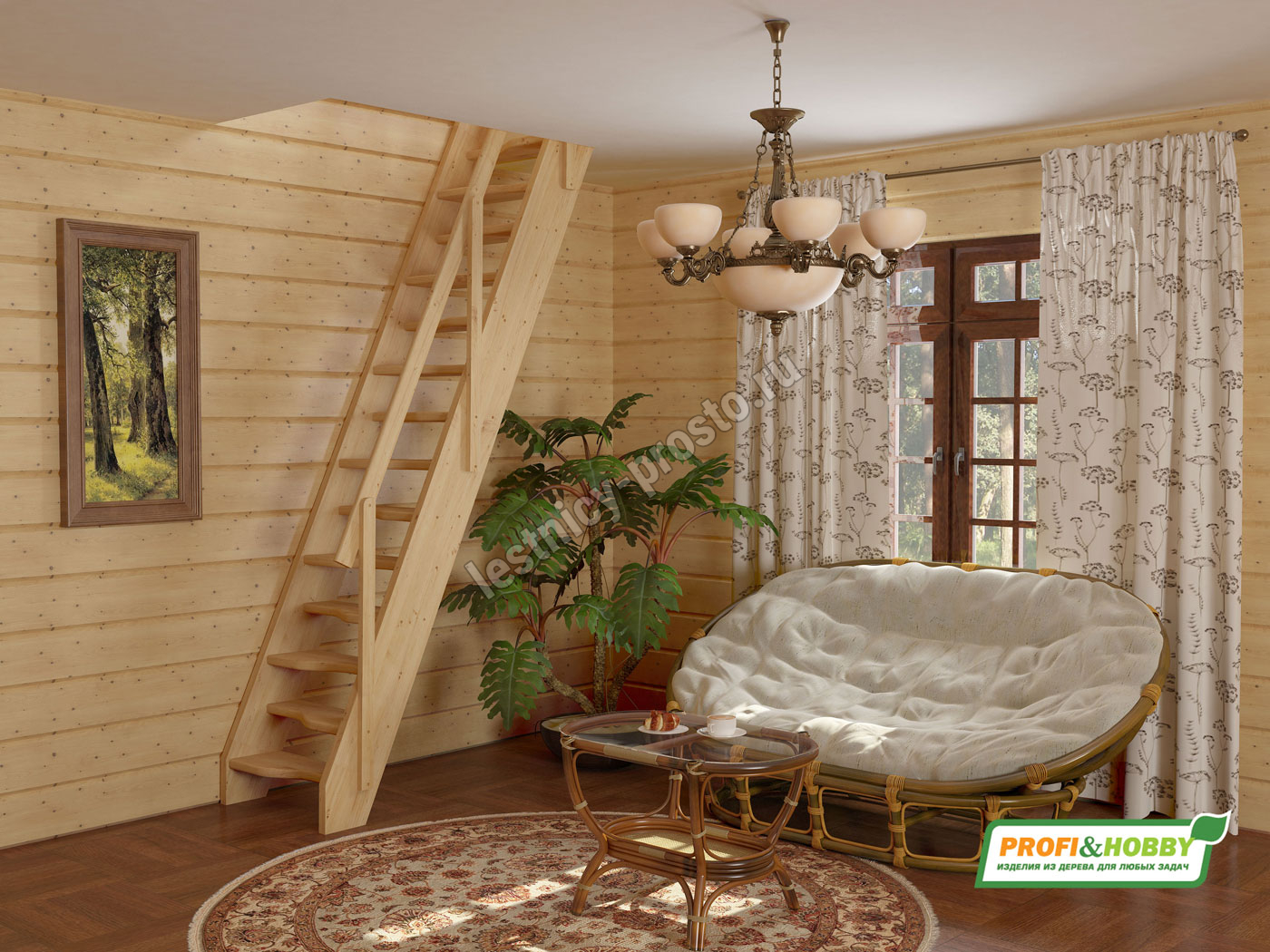 Ступени и поручень лестницы изготовлены из ясеня, остальные элементы из сосны.