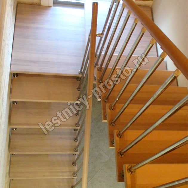 Ступени лестницы изготовлены из лиственницы категории А/В паркетной склейки без какого-либо покрытия. Вы можете заказать у нас предварительную профессиональную покраску деревянных элементов материалами БИОФА в широкий спектр цветов (стоимость зависит от количества ступеней).