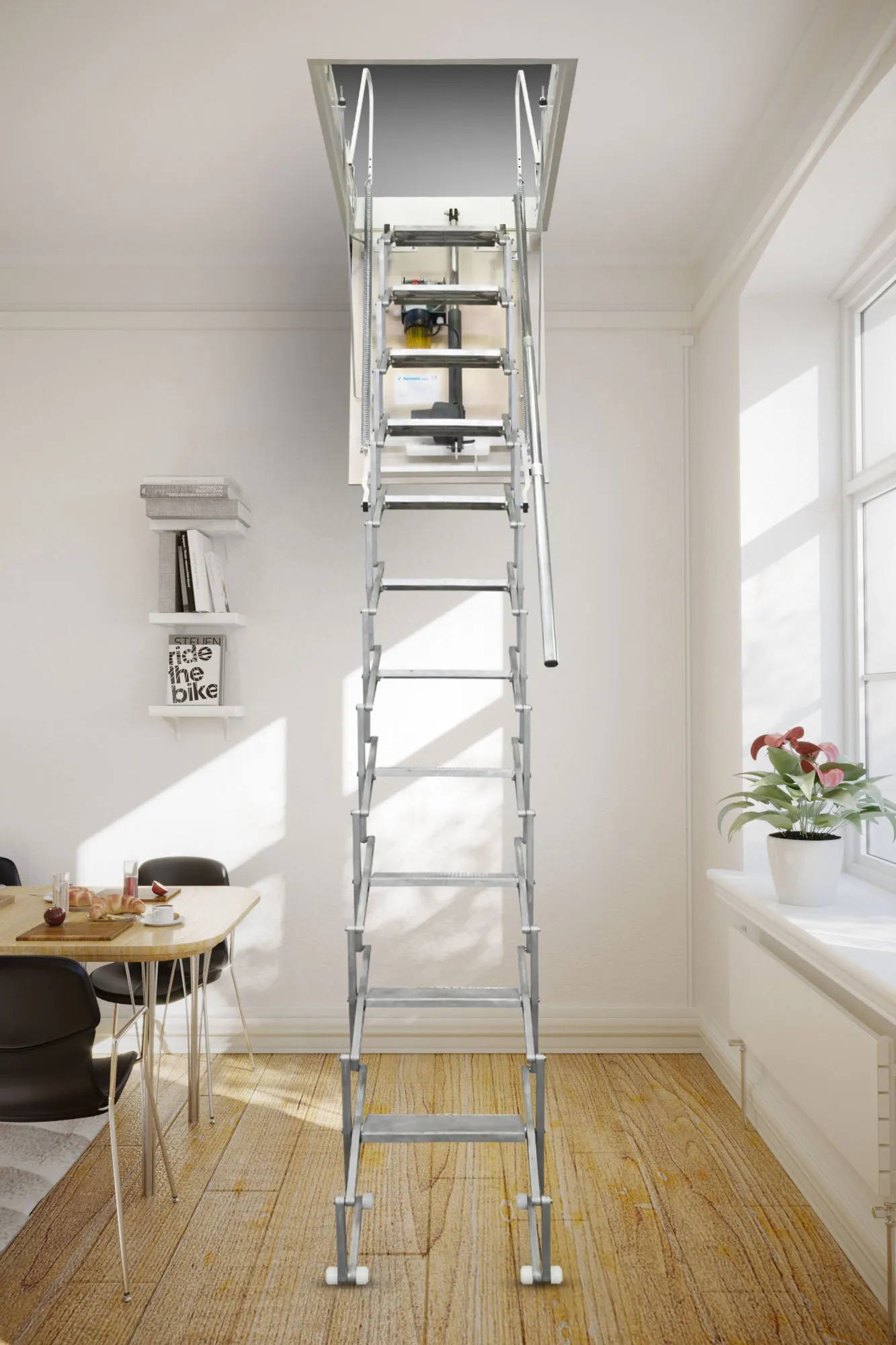 Высота лестницы регулируется при сборке в пределах 2530 - 3060 мм. С помощью дополнительных секций высоту базовой модели можно увеличить до 3770 мм.