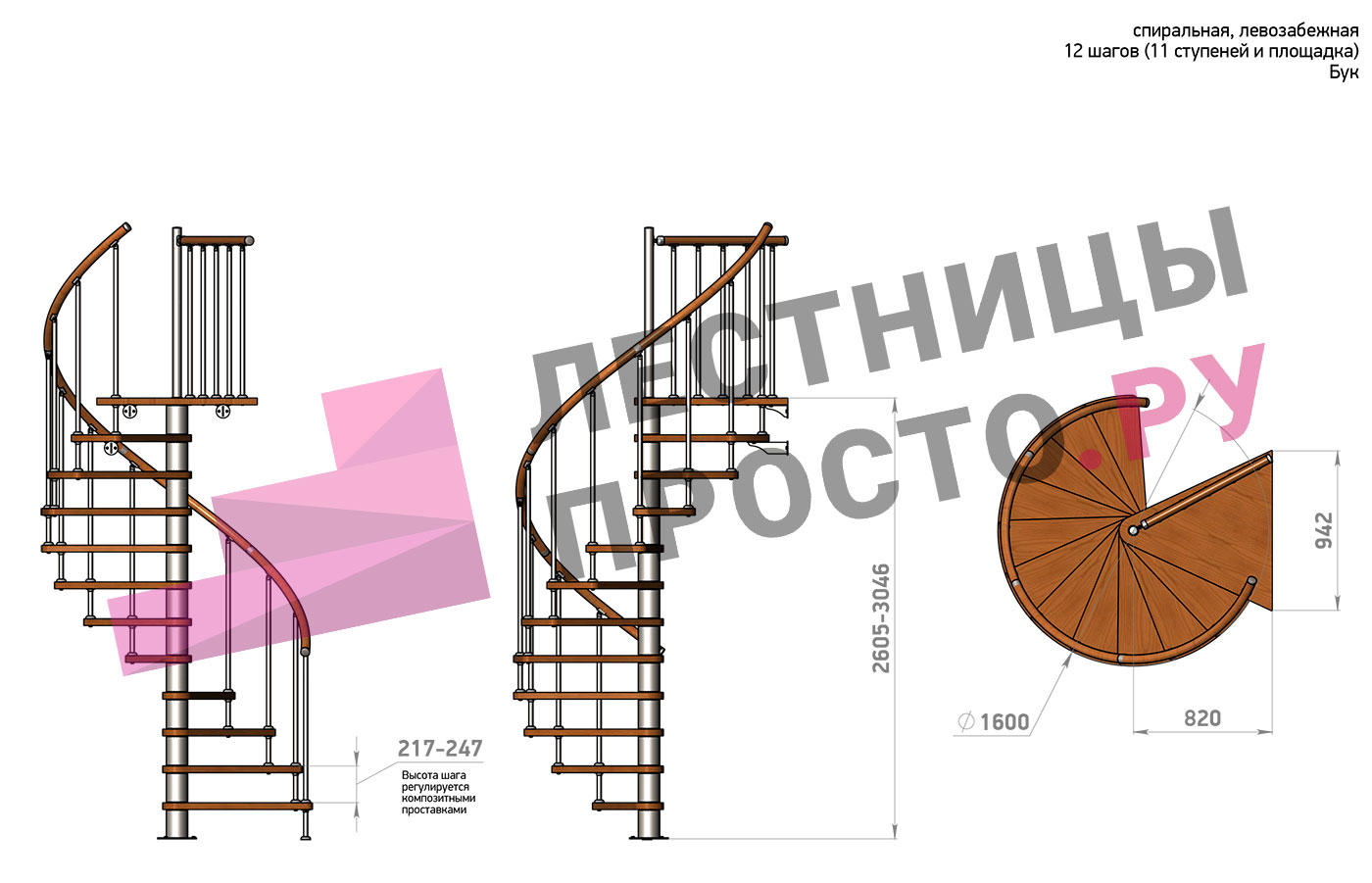 Решение о направлении поворота принимается при сборке лестницы - универсальная конструкция позволяет собрать правозабежную и левозабежную лестницы. Высота ступеней регулируется с шагом 3 мм. в пределах 217-247 мм., благодаря чему, лестница прекрасно подгоняется под необходимую высоту.