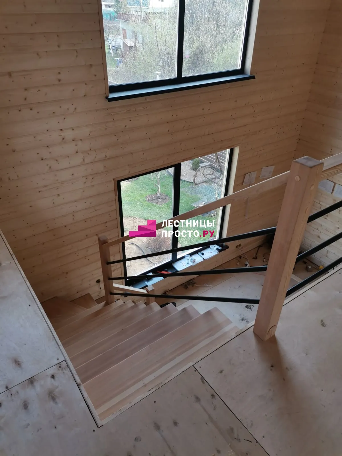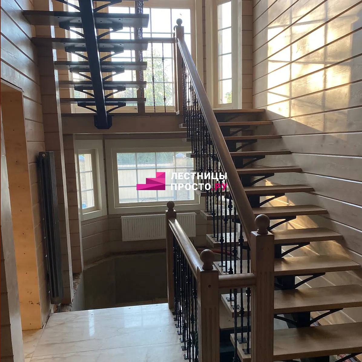 Лестница на центральном металлическом каркасе с просторной площадкой