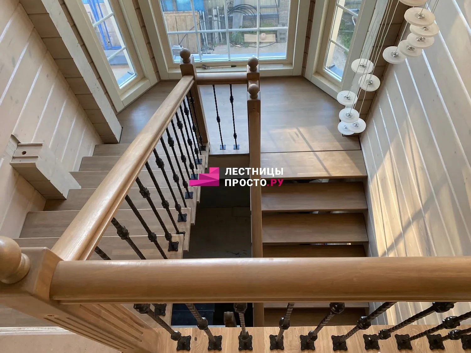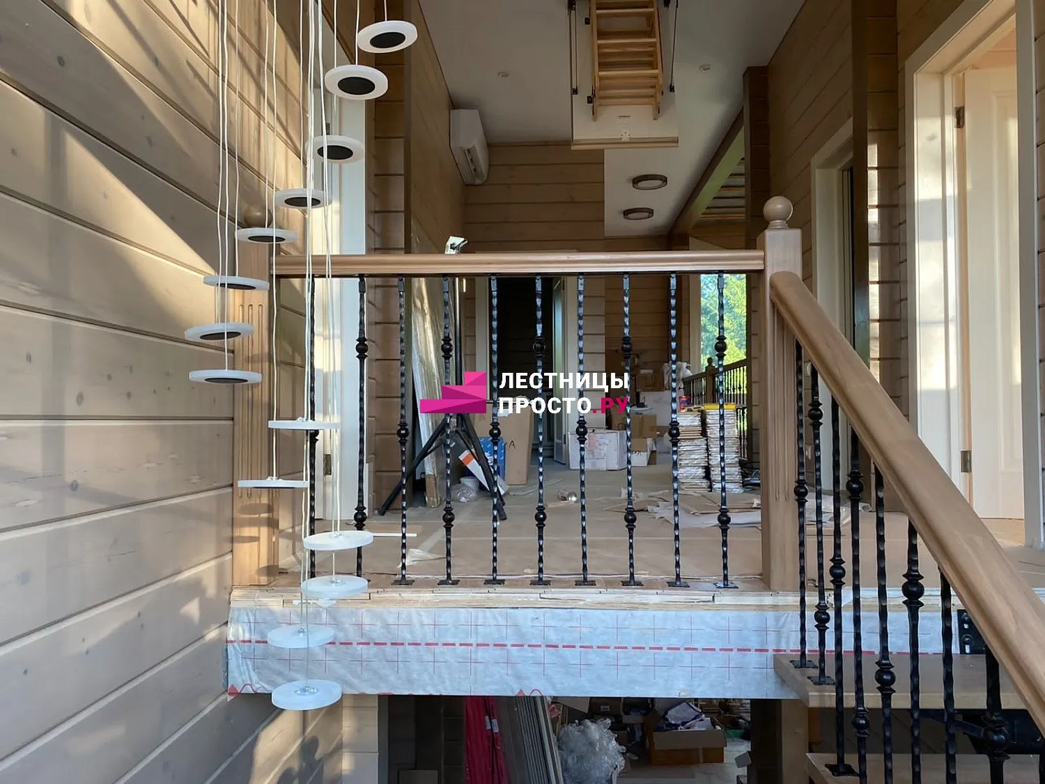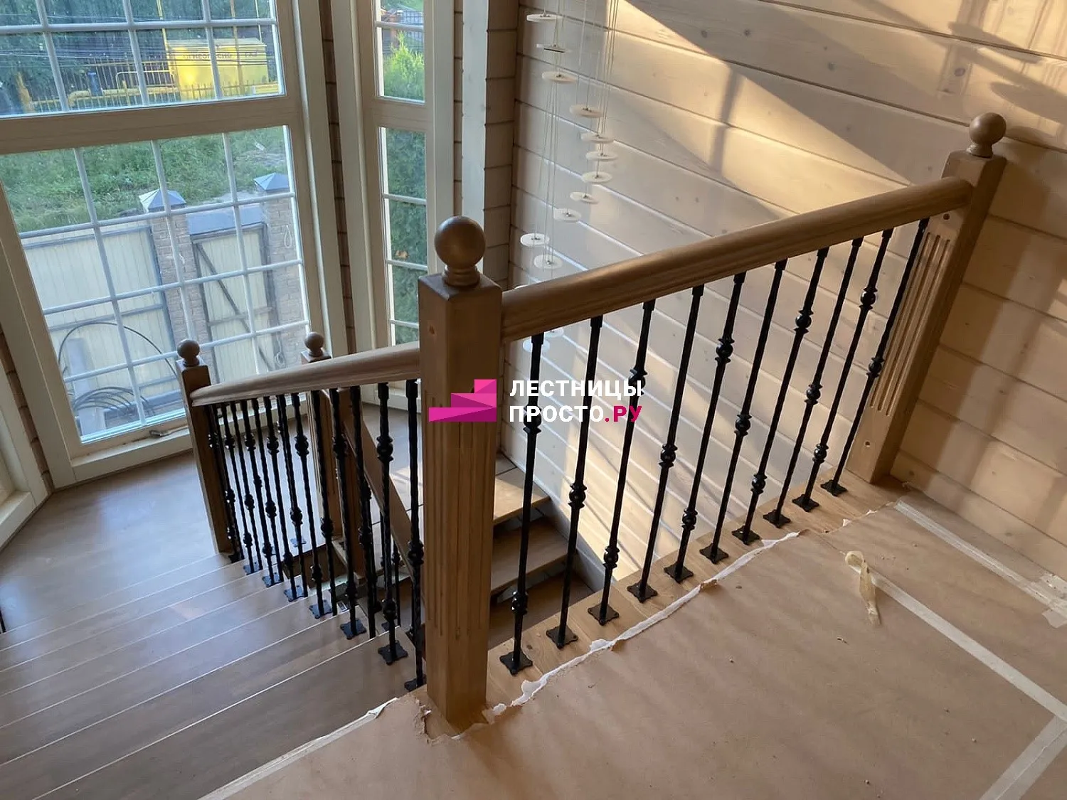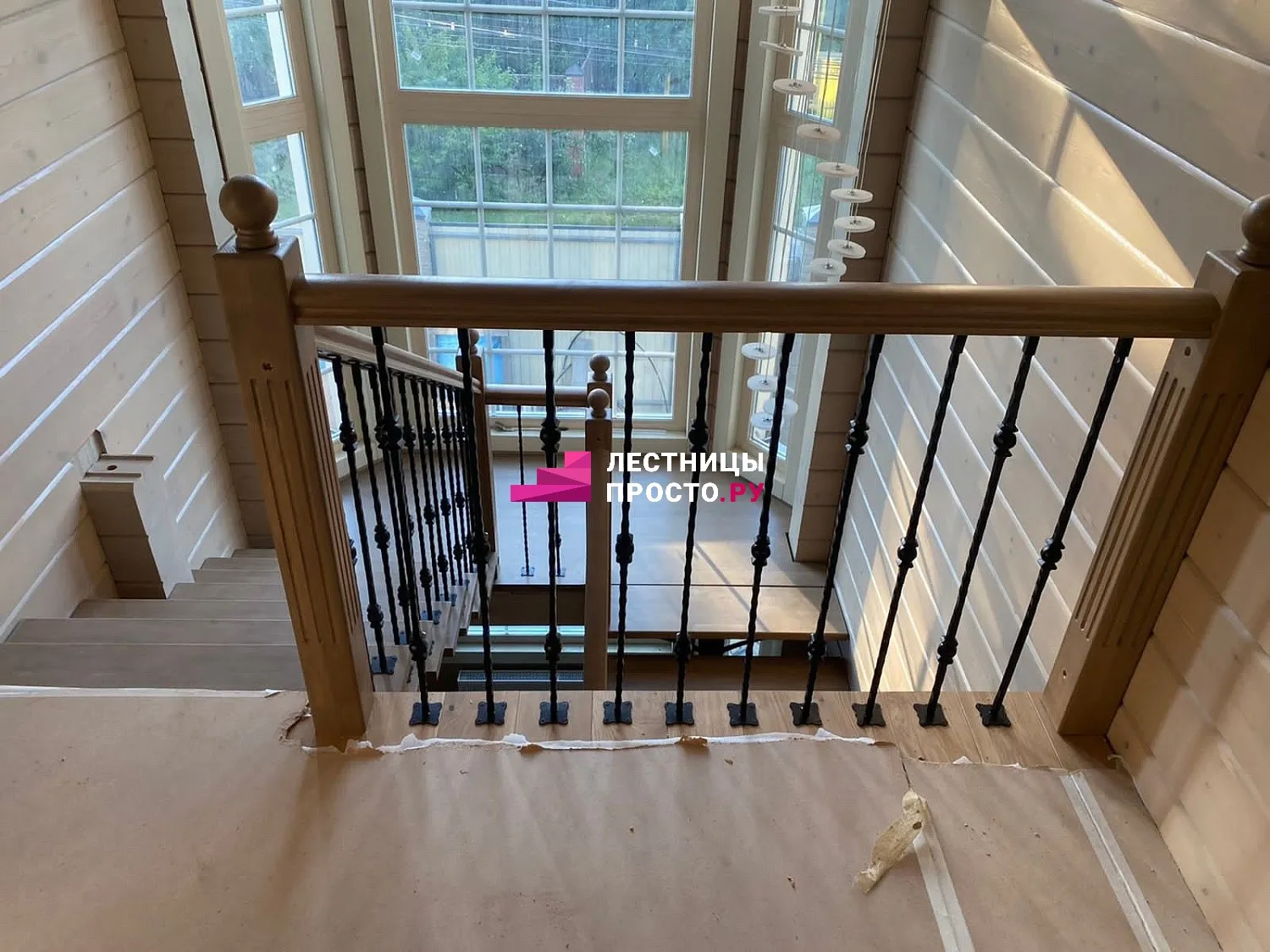 • ограждение: стойки кованые по 2 шт. на ступень 0126Т (1 и 2 бобышки - чередовать), столбы 100х100 (сверху шар; 3 канелюра, бук), поручень бук;