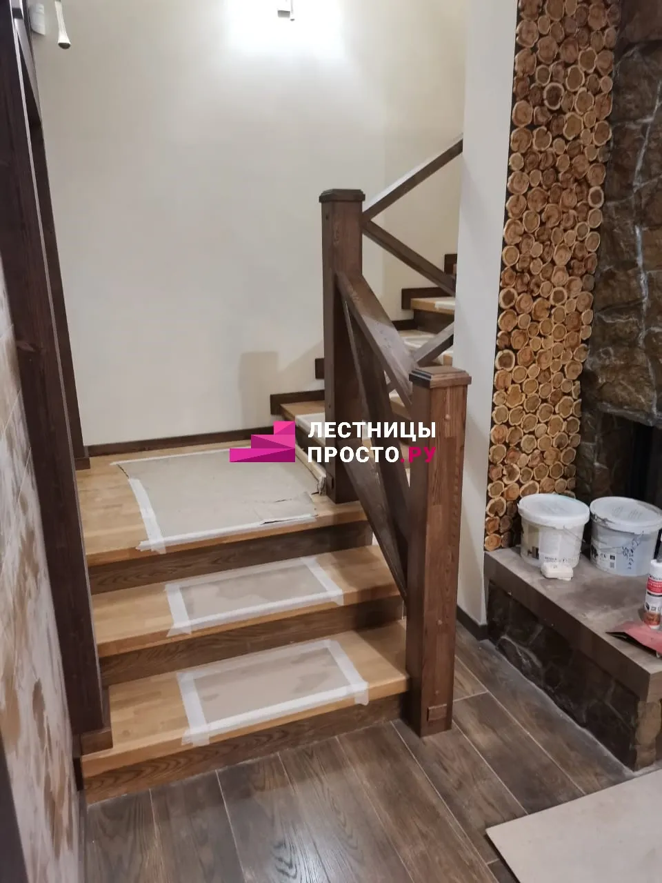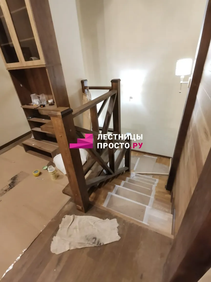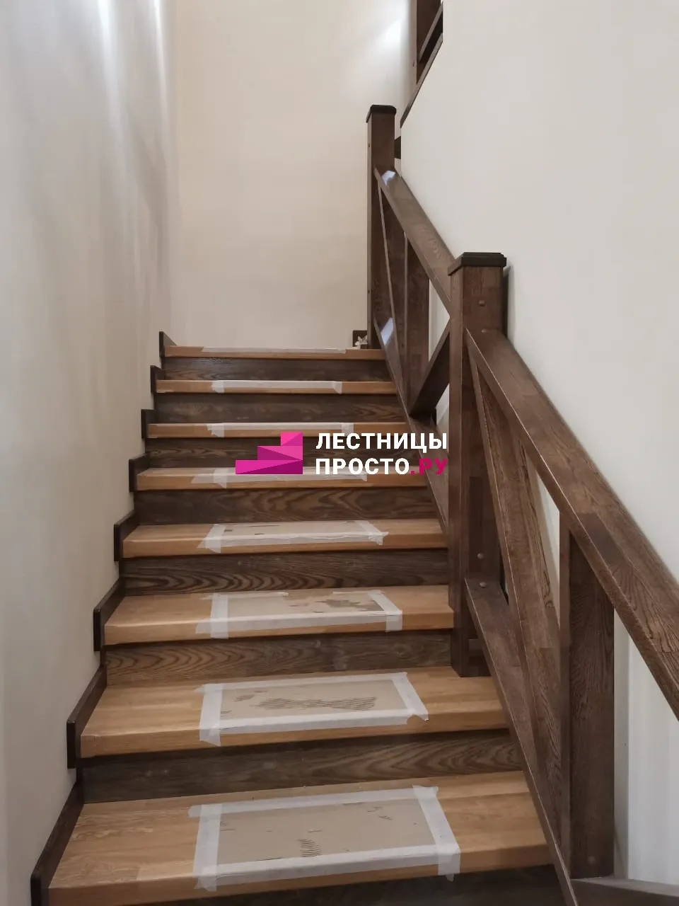 Покраска лестницы осуществлена средством Varathane, цвет был подобран максимально близко в образцу, предоставленному Покупателем.
