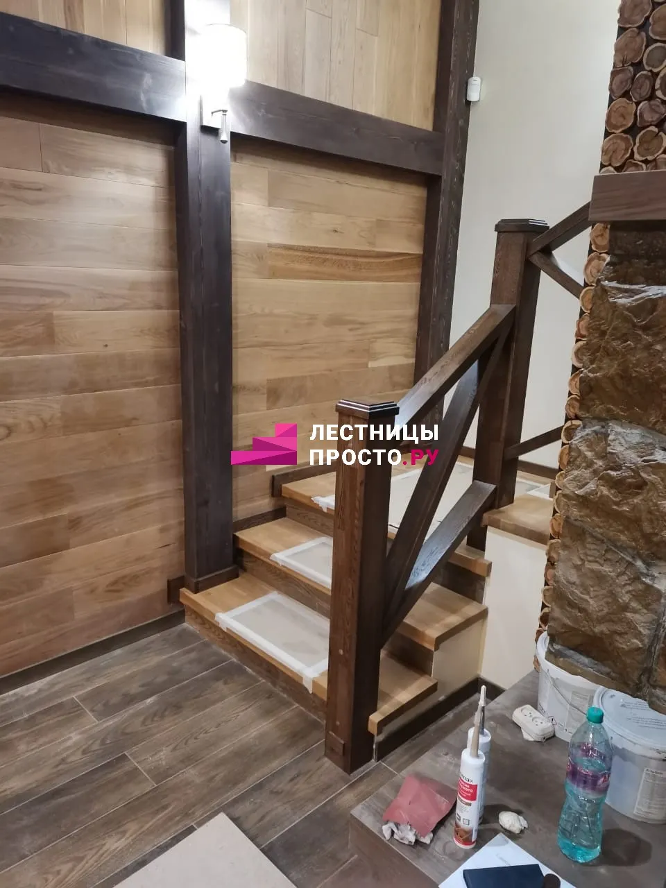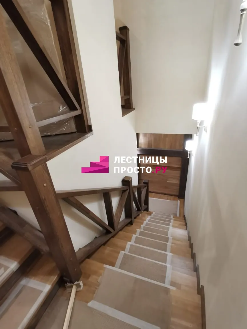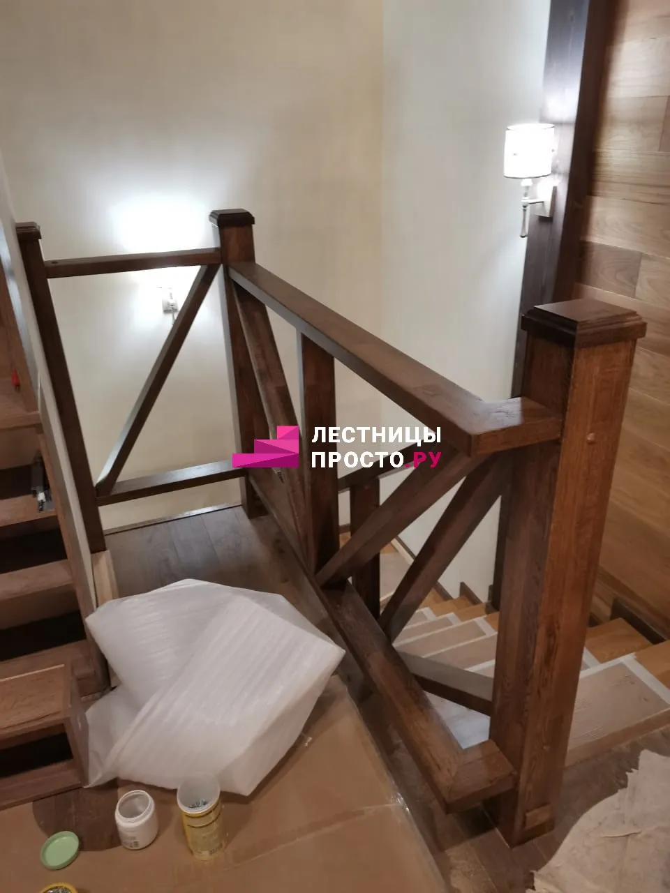Покраска лестницы осуществлена средством Varathane, цвет был подобран максимально близко в образцу, предоставленному Покупателем.